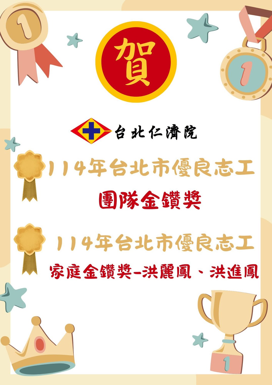 賀!本院榮獲114年台北市政府優良志工團隊金鑽獎及家庭金鑽獎